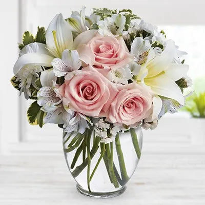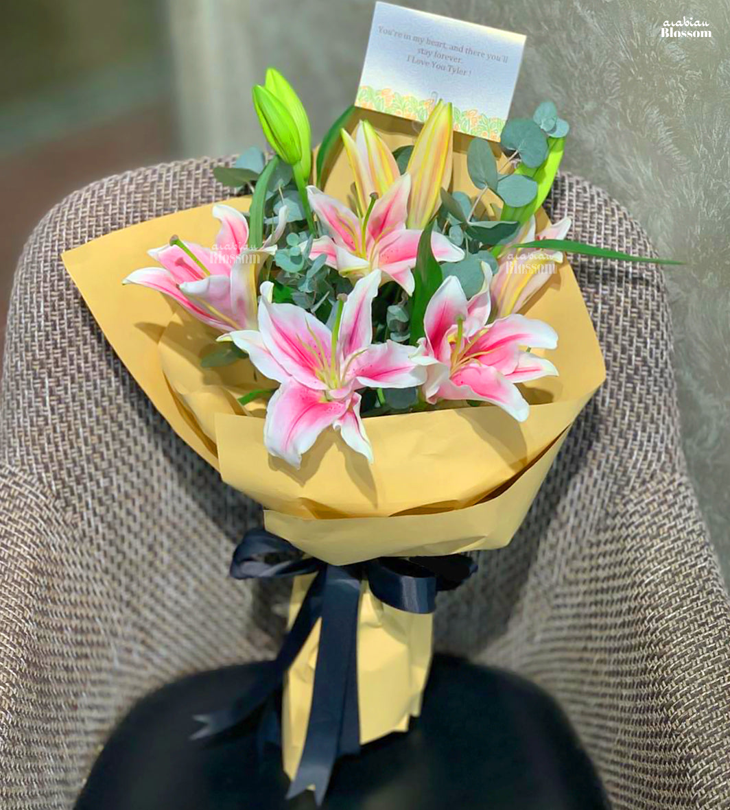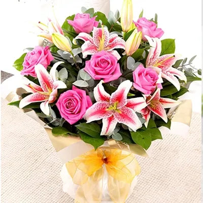 Pink Lilly and Roses Bouquet -Flower for Newborn and Mom - 3 Stems Of Pink Lily & 8 Stems Of Pink Rose