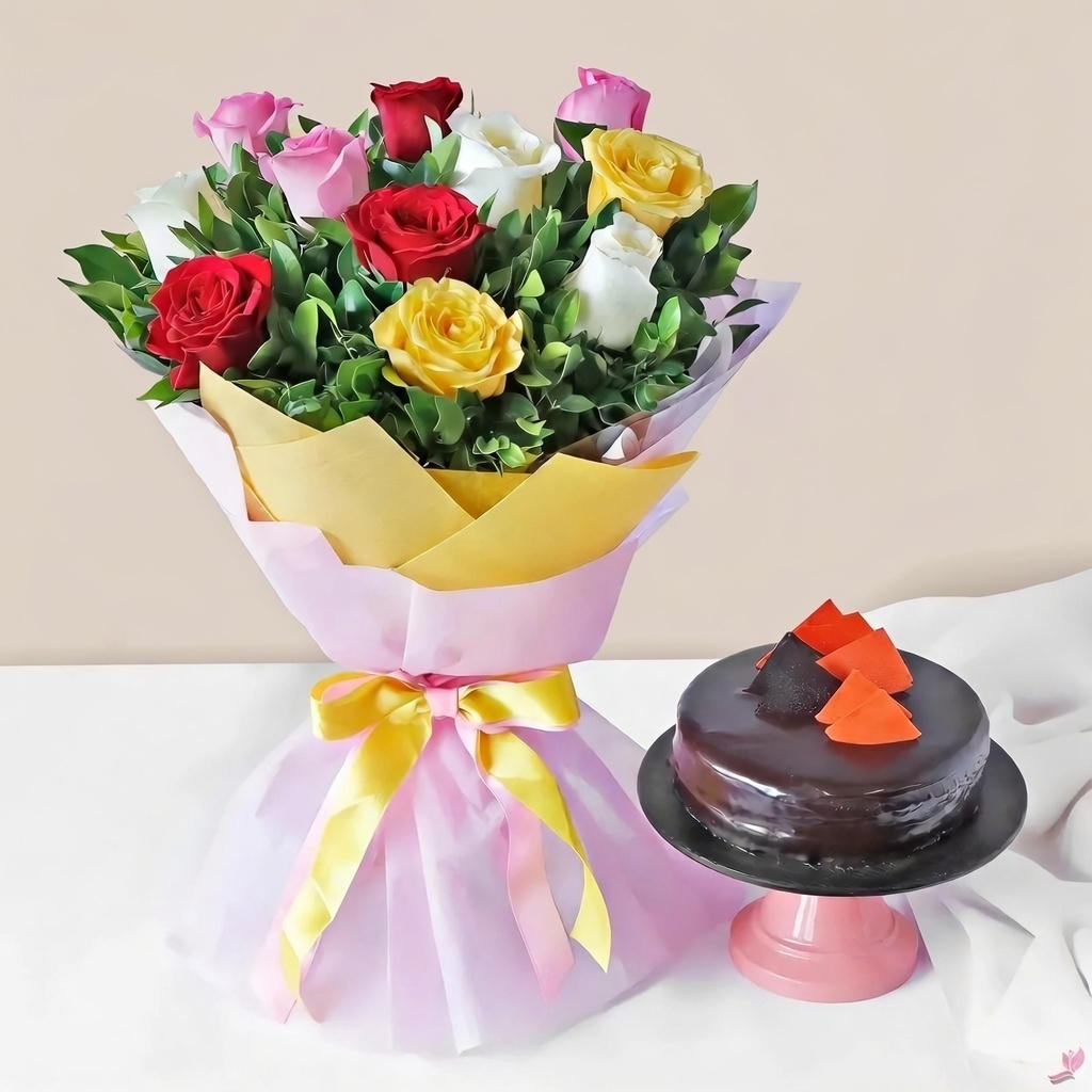 Flower & Cake Details: The bouquet features 12 fresh stems of red, white, pink, and yellow roses, elegantly wrapped for a polished presentation. Accompanied by a 1/2 kg chocolate cake, this combo is ready to impress for birthdays, anniversaries, or romantic surprises.