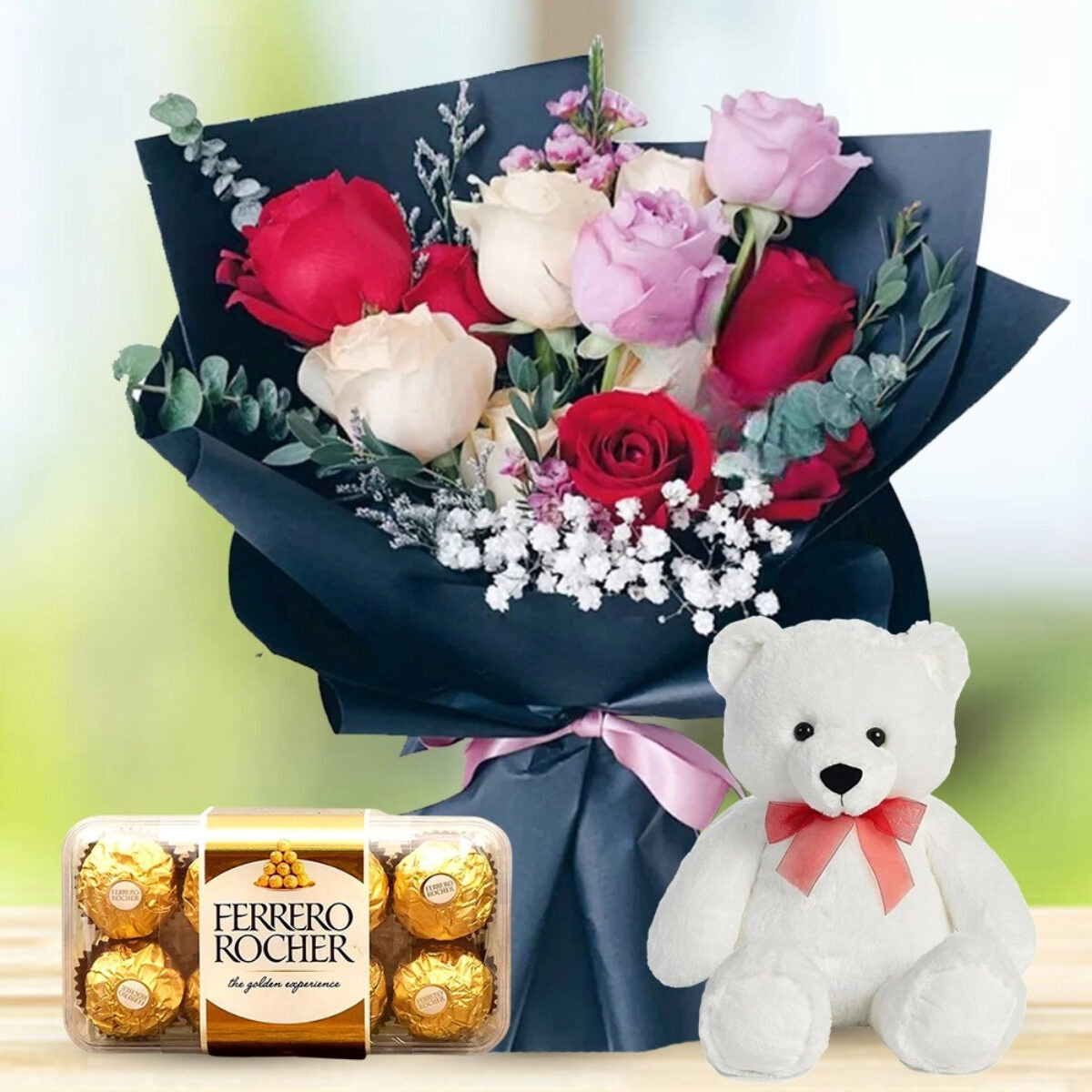 Bouquet of 5 stems of red roses 5 stems of peach roses 2 stems of purple roses with fillers in a nice wrapping with 16pcs ferrero rocher and 8inch white teddy bear